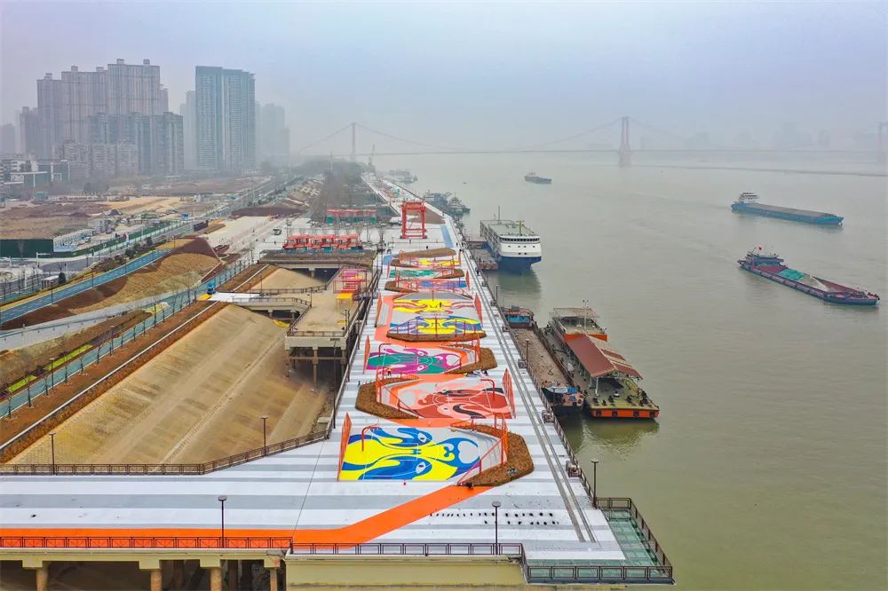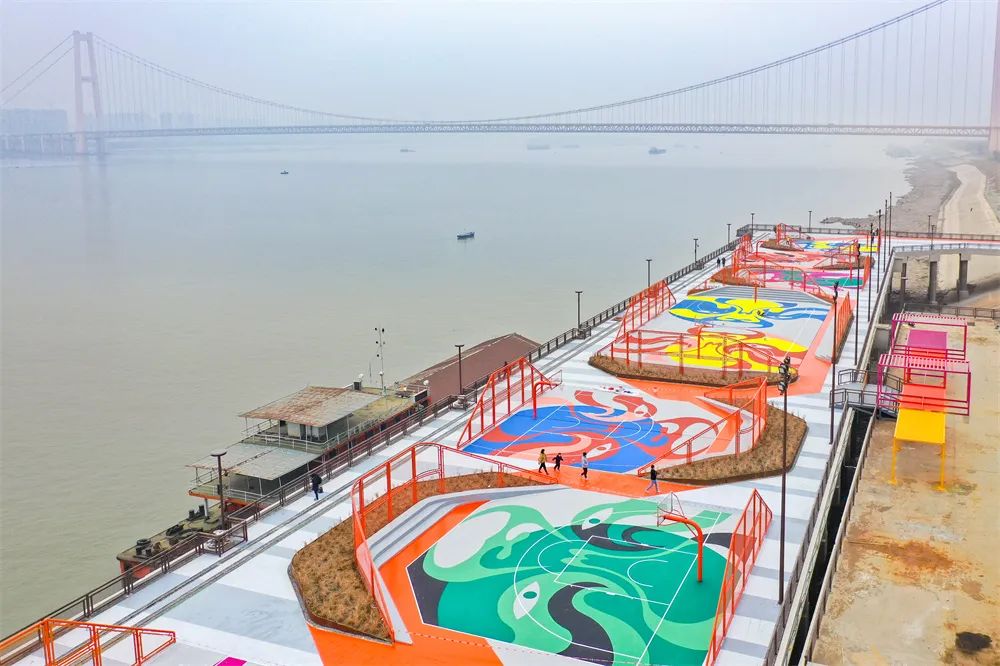 ? ? ? ?除了對原有碼頭元素創(chuàng)新改造,高樁平臺上的活動(dòng)區(qū)域也亮點(diǎn)紛呈:平臺兩端都建設(shè)了約兩米寬的玻璃棧道,站在上面,低頭就可以看見滾滾奔流的長江水;面向江心左邊,是全國唯一的國風(fēng)籃球場,從空中俯瞰,精致的京劇臉譜整齊排列在球場內(nèi),為岸線添上一抹色彩。正是通過這種漸進(jìn)式改造,讓更多城市歷史文化記憶在江灘活起來、傳下去。