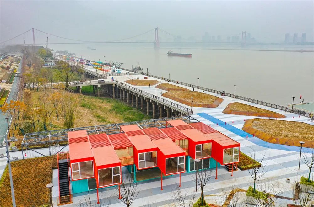 ? ? ? ?原碼頭伸向江心的高樁平臺被保留下來,以“浮江展廳”為設(shè)計(jì)理念,進(jìn)行整體規(guī)劃。龍門吊和集裝箱是碼頭最具代表的工業(yè)元素,慶典廣場,一座巨型龍門吊被保留在了廣場中央,改造成了長江江面上的第一處水幕電影的“放映機(jī)”,可以作為大型活動(dòng)、表演場地。一旁的集裝箱工坊則可用于驛站或服務(wù)中心,更重要的是,集裝箱和拼裝式防洪墻可根據(jù)防汛需要即時(shí)拆建。